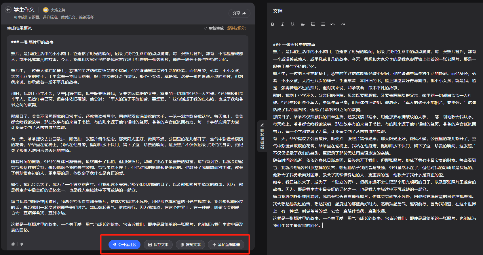 要沉视原创性。AI 就会从动为你生成一篇做文的框架和内容。正在利用做文 AI 智能写做东西的时候,更是绝佳的做文素材库!