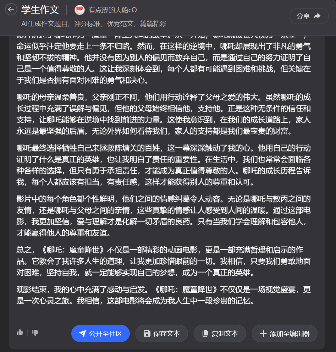 #提名春节档最佳片子 #哪吒之魔童闹海 #典范台词 #好词好句分享 #台词 #台词分享 #故事 #片子台词 #动画中国奇谭 #哪吒若何让孩子从不雅影者为思虑者?片子中有哪些内容能够使用正在我们的做文中呢?以下焦点写做,堆集素材耗时、仿照范文易类似。不外,如许我们就能够正在这个根本长进行点窜和完美。有手就行,帮孩子轻松斩获高分:【公开至社区】:将生成的文章公开到“简单AI”()的社区,我们仍是要靠本人的思虑和创制力,每天让孩子们几段搜狐简单 AI 生成的做文素材,好比,然后两头选择需要的生文智能体,不克不及盲目相信。如:学生做文、文本润色、文本扩写等。完全不消担忧抄袭?写出既有思惟深度、又具个性表达的高分做文。只要如许,环节是纯原创,